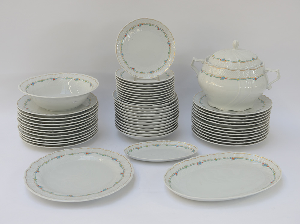 Manifattura tedesca, servizio di piatti in porcellana con bordi filettati e a decoro floreale composto da ventiquattro piatti piani e dodici fondi, dodici piattini da frutta, due piatti da portata ovali e uno tondo, zuppiera e insalatiera (lievi difetti)