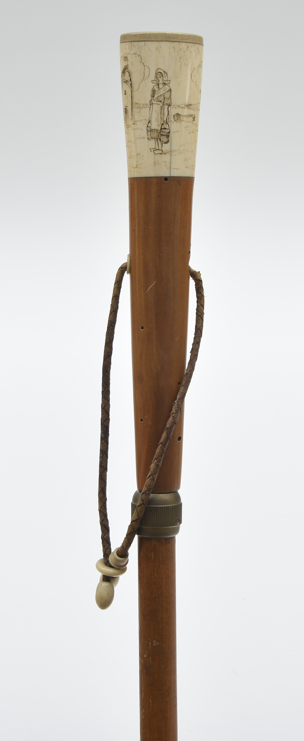 Bastone con presa in avorio incisa a paesaggio olandese con figure. Foro...