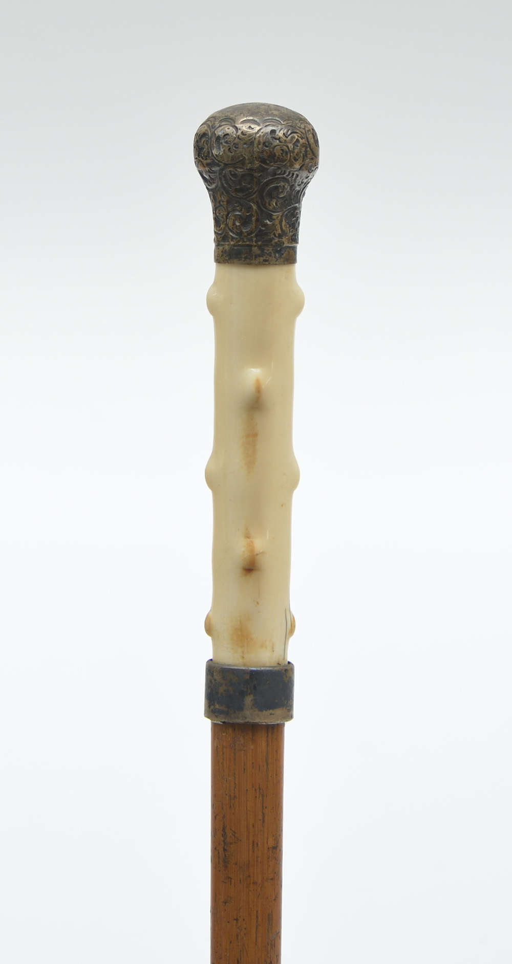 Bastone con presa in avorio e pomolo in argento sbalzato. Inghilterra, fine secolo XIX