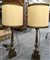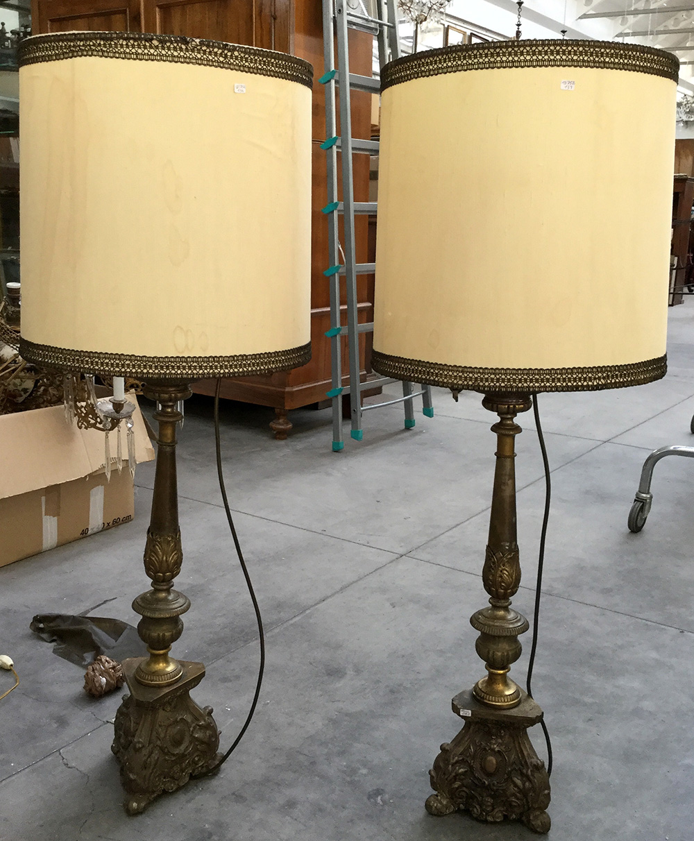 Coppia di portaceri in metallo sbalzato e argentato con decori a foglie e volute, montati a luce elettrica, completi di paralumi (h cm 110) (difetti)