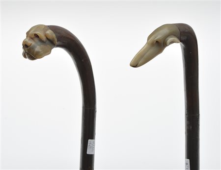 Lotto composto da due bastoni in legno con prese in corno decorate a teste canine (difetti e restauri)