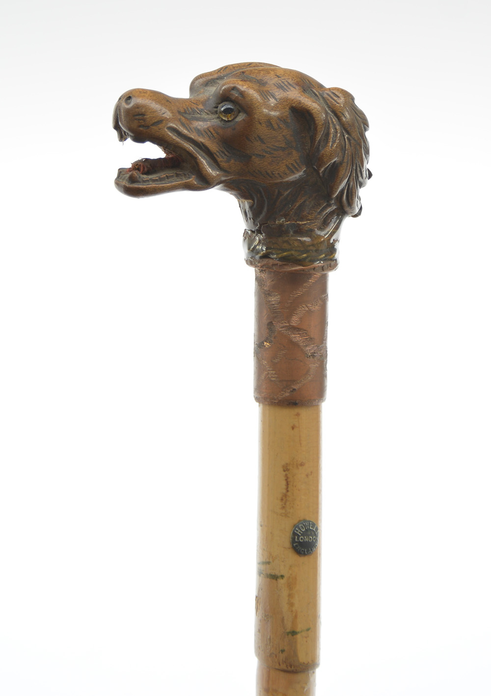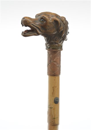 Bastone con presa in legno a testa di cane e ghiera in rame. Howell, Londra,...