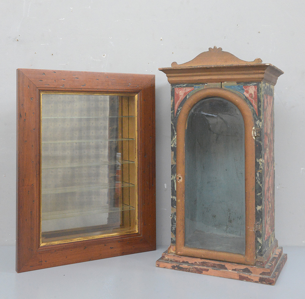 Lotto composto da una vetrinetta in legno laccato e una teca portaoggetti (difetti)