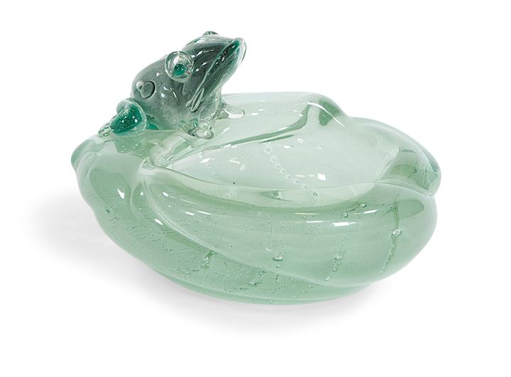 Ciotola con rana in vetro fumato verde e inclusione di bolle.