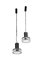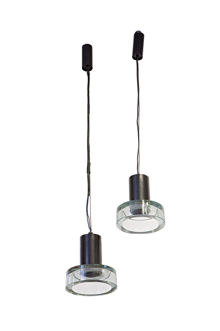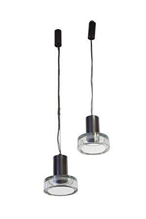 POLI FLAVIO Due lampade a sospensione in vetro pesante con corona metallica....