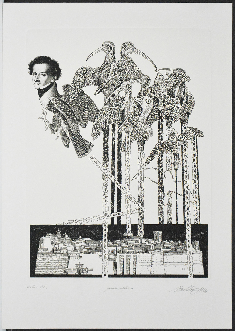 Valeriano Trubbiani (Macerata 1937) "Passero solitario" acquaforte - prova d'artista (lastra cm 36x26,5; foglio cm 47x33) iscritta, titolata e firmata in basso a matita.