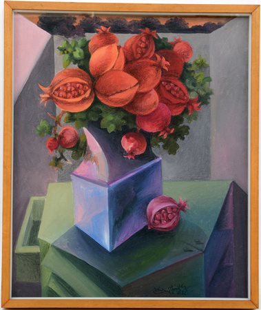 Ercole Pignatelli (Lecce 1935) "Pianta di melagrane" 1982, olio su tela (cm 55x46) firmato e datato in basso a destra. Firmato, datato, titolato e dedicato al retro, in cornice