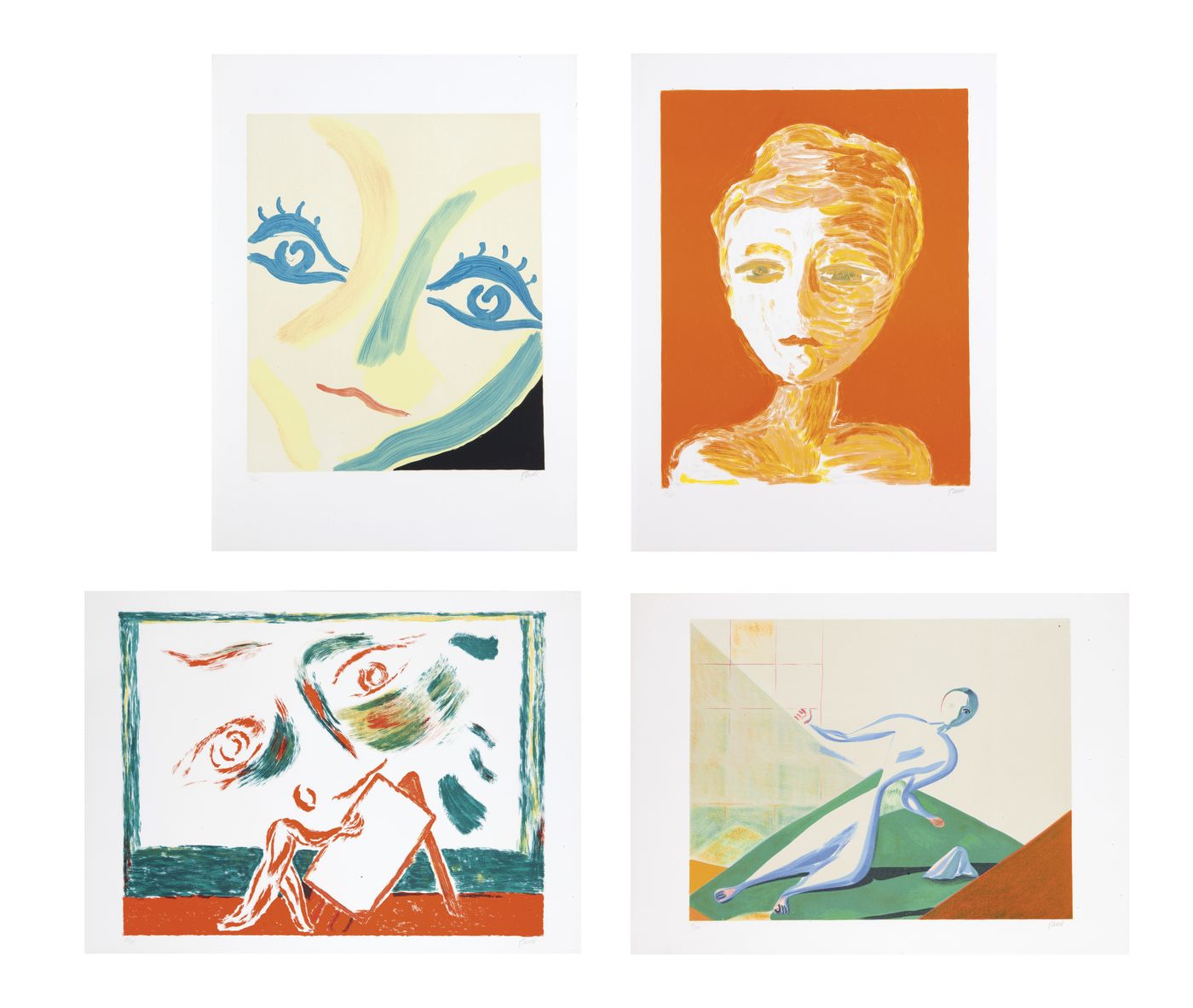 GUIDI VIRGILIO Roma 1891 - 1984 Venezia Cartella composta da 4 litografie a colori, es. 69/125: -"La donna nella stanza", 56x76 (foglio) 46x58 litografia firmata in basso a destra, numerata in basso a sinistra -"Volto", 76x56 (foglio) 55x45 litografia firmata in basso a destra, numerata in basso a sinistra -"La baronessa", 76x56 (foglio) 60x47 litografia firmata in basso a destra, numerata in basso a sinistra -"Pittore nello studio", 56x76(foglio) 50x65 litografia firmata in basso a destra, numerata in basso a sinistra