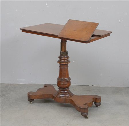 Carrello portavivande da letto in noce, con piano tripartito munito di due leggii, montante a colonna tornita con altezza regolabile. Secolo XIX (cm 88x86x48) (difetti)