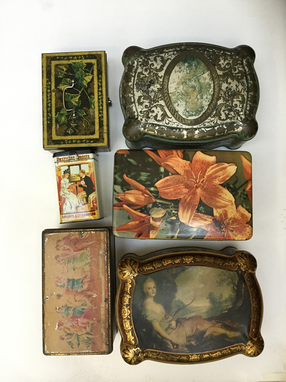 Lotto di sei scatole in latta serigrafata di dimensioni e fatture differenti (difetti)