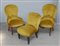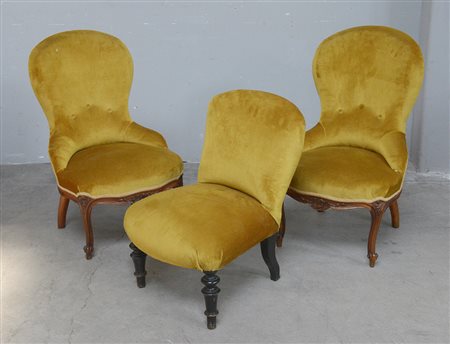Lotto composto da una coppia di poltroncine da camera con gambe mosse ed una con gambe anteriori tornite ed ebanizzate, rivestimento in tessuto color senape (difetti)