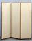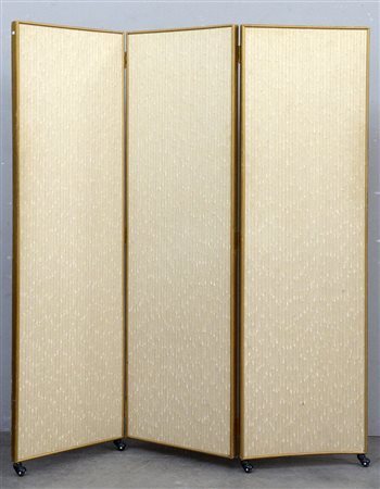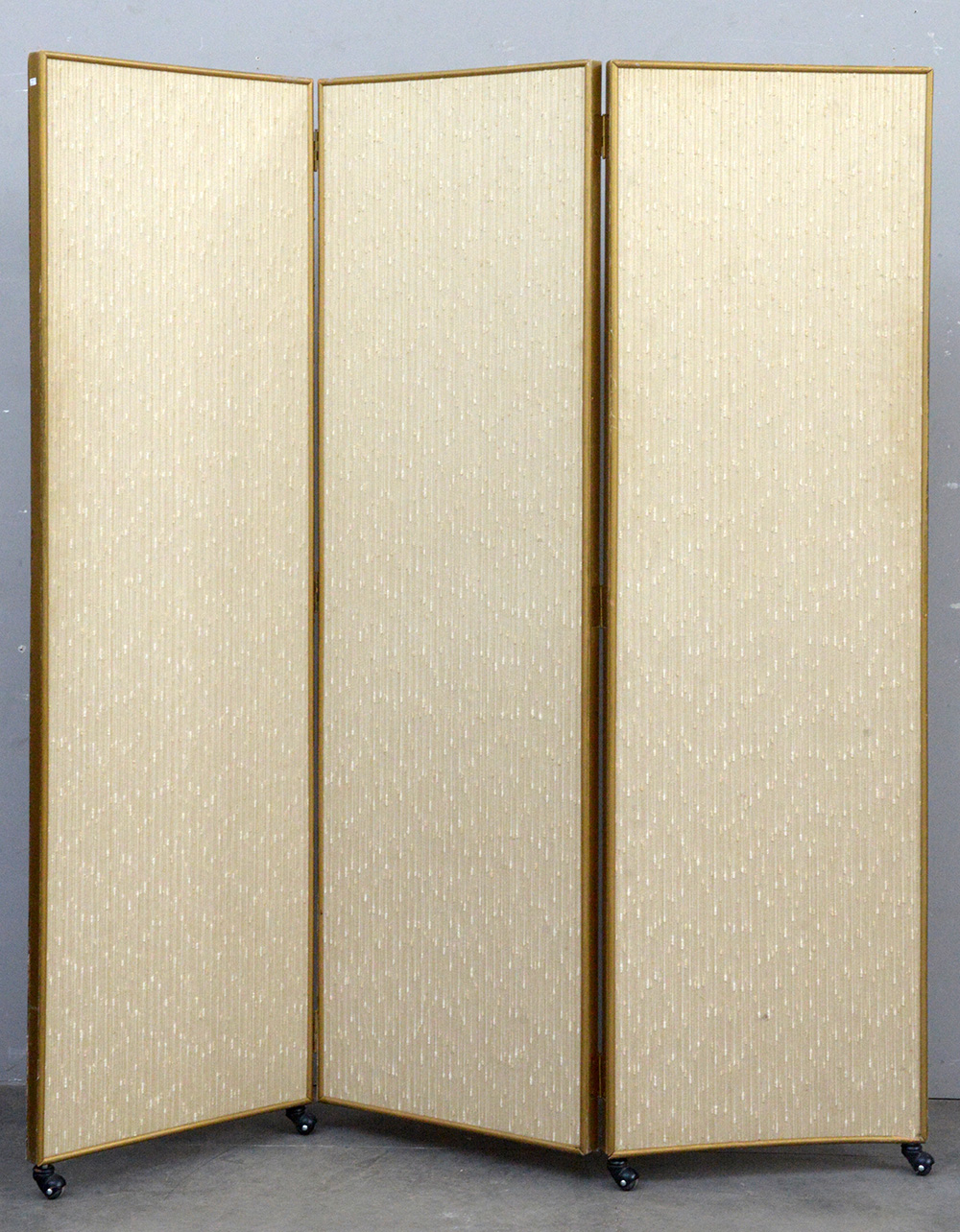 Paravento a tre pannelli con cornici in legno dorato rivestito in tessuto color crema (cm 150x168) (difetti)