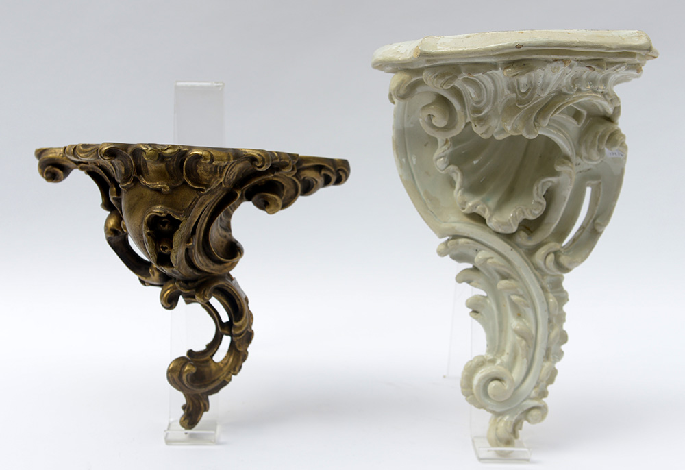 Lotto composto da una mensola in terraglia e una in legno dorato (difetti)