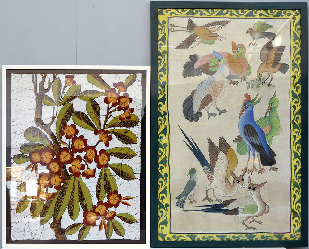 Lotto composto da un batik con rami fioriti e un disegno su tessuto raffigurante uccelli (cm 87x70 e 115x72), in cornici (lievi difetti)