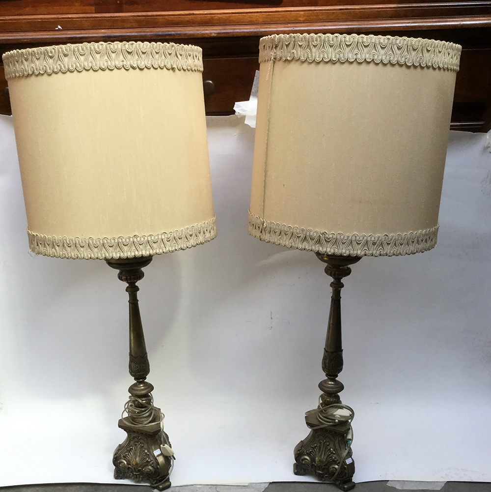 Coppia di portaceri in metallo sbalzato e argentato con decoro a foglie e volute montate a luce elettrica completi di paralume (h cm 67) (difetti)