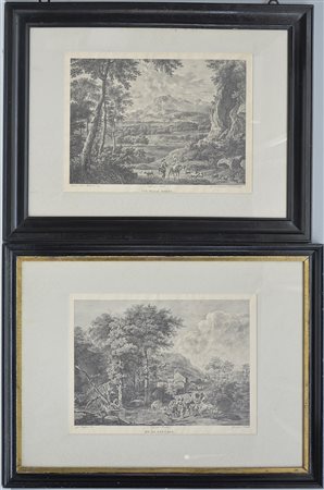 Lotto di due incisioni raffiguranti paesaggi, in cornici in legno ebanizzato...