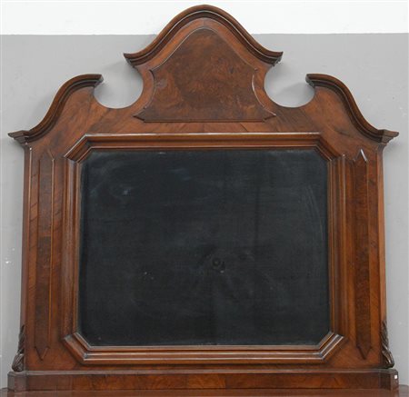 Caminiera in noce con specchiature radicate, cimasa mossa e spezzata. Secolo...