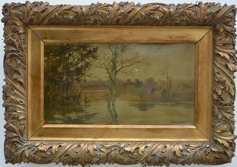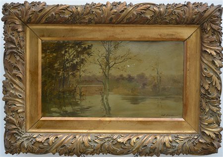 Antonio Oberto (Baselica Bologna (Pavia) 1872 - Pavia 1954) "Paesaggio fluviale" olio su cartone (cm 28x50) Firmato in basso a destra. In cornice (difetti)