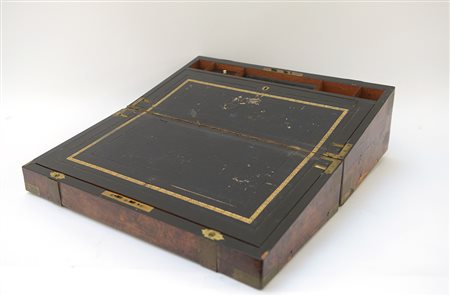 Scrittoio da viaggio in radica decorato con borchie in ottone. Interno con...