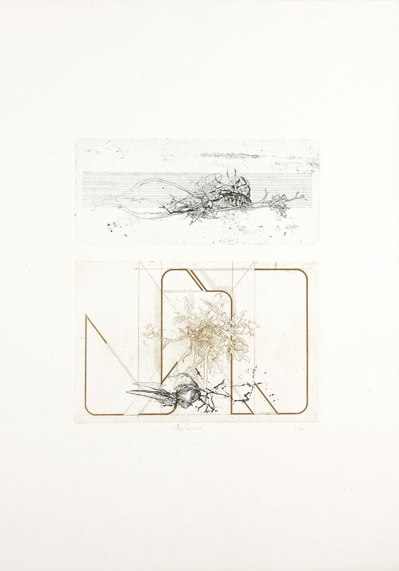 SARONI SERGIO Torino 1934 - 1991 "Nido" 70x50 (foglio) 34x30 acquaforte, es. 1/100 Opera firmata in basso al centro, numerata in basso a destra