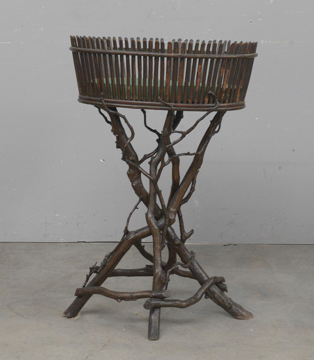 Fioriera con cestello ovale e sostegno realizzato con rami intrecciati (h cm 87) (difetti e mancanze)