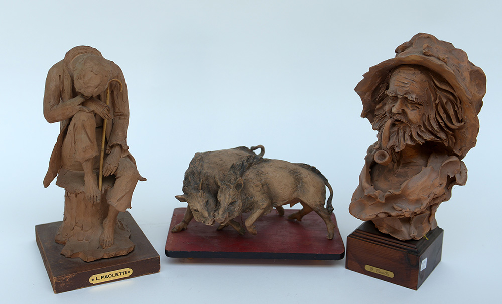Lotto composto da tre sculture in terracotta raffiguranti facoceri e personaggi popolari (difetti)