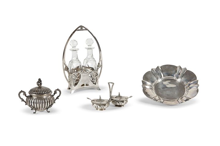 Lotto in argento composto da: un'oliera di epoca Liberty, con bottiglie in cristallo;