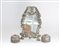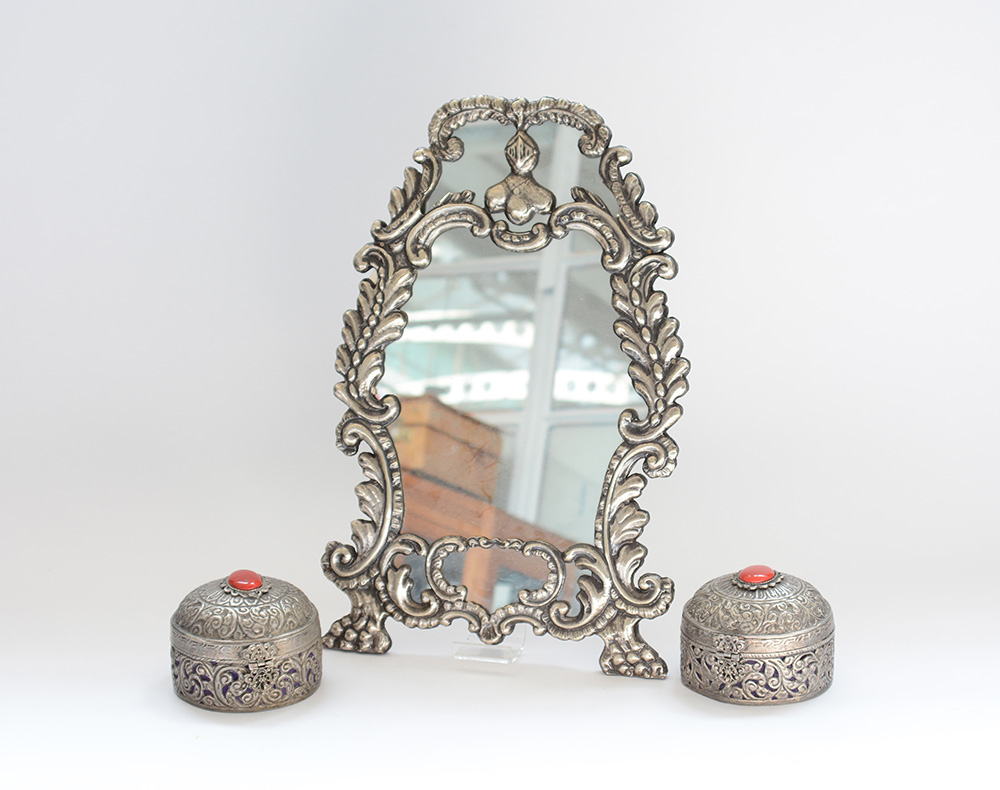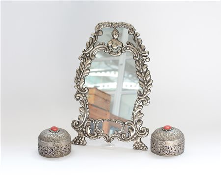 Lotto composto una piccola specchiera con cornice in argento sbalzato decorato a volute (cm 31x48) e una coppia di contenitori in stile etnico in metallo sbalzato (difetti)