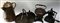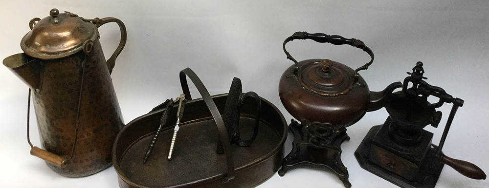 Lotto composto da una teiera con supporto, un macinino, un antico ferro da stiro, un versatoio con manico, un contenitore e due schiaccia noci (difetti)