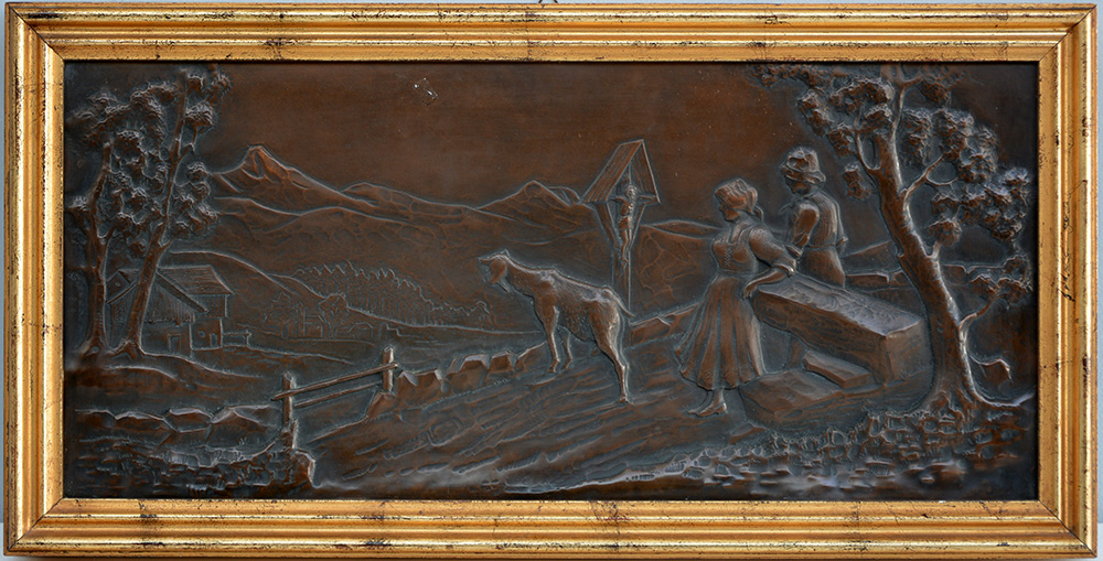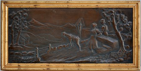Bassorilievo in rame raffigurante un paesaggio agreste con figure (cm 28x61) in cornice