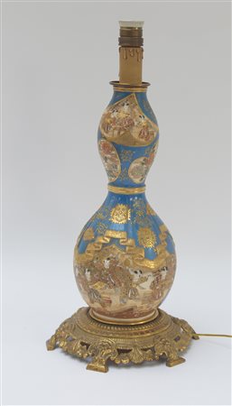 Vaso in porcellana in stile Satsuma con montatura in bronzo dorato di manifattura europea, montato a lampada decorato con figure (lievi difetti) Giappone, periodo Meiji (la porcellana, h. 39 cm.)