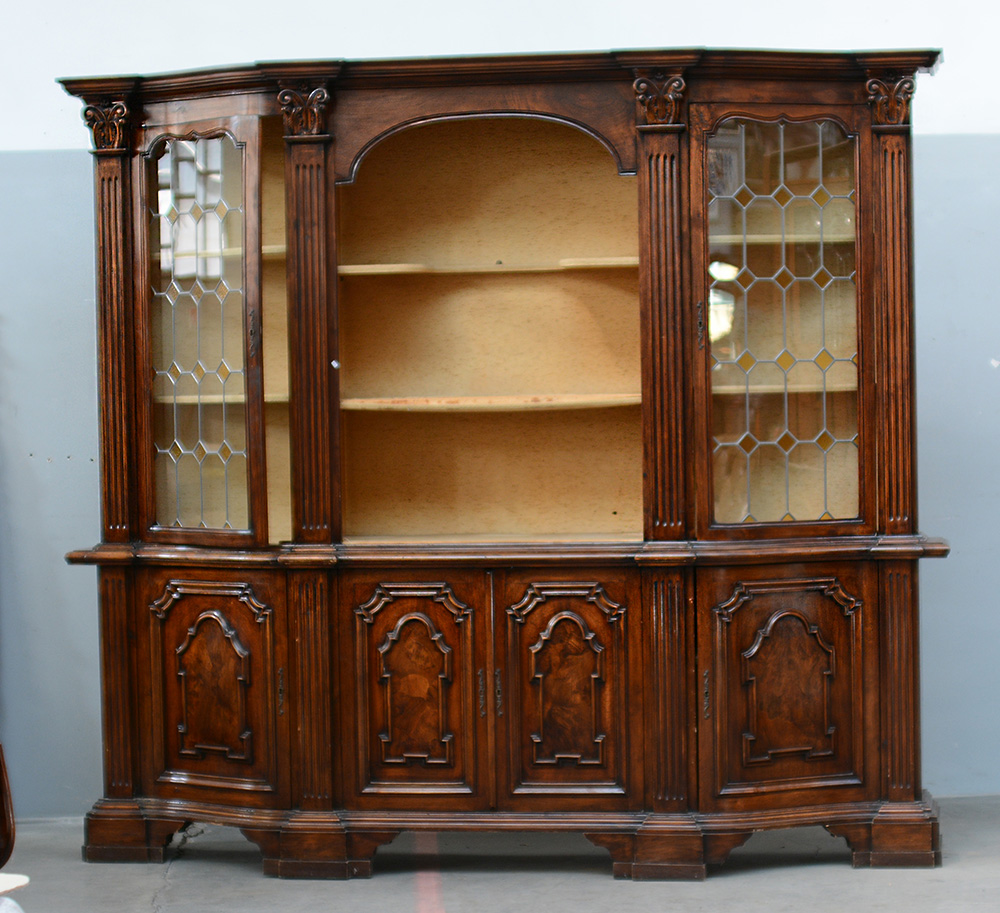 Mobile libreria a due corpi in legno a tinta scura con fronte mossa. Parte inferiore a quattro battenti, parte superiore con due sportelli a vetri e vani a giorno nel centro (cm 246x221x50) (difetti)