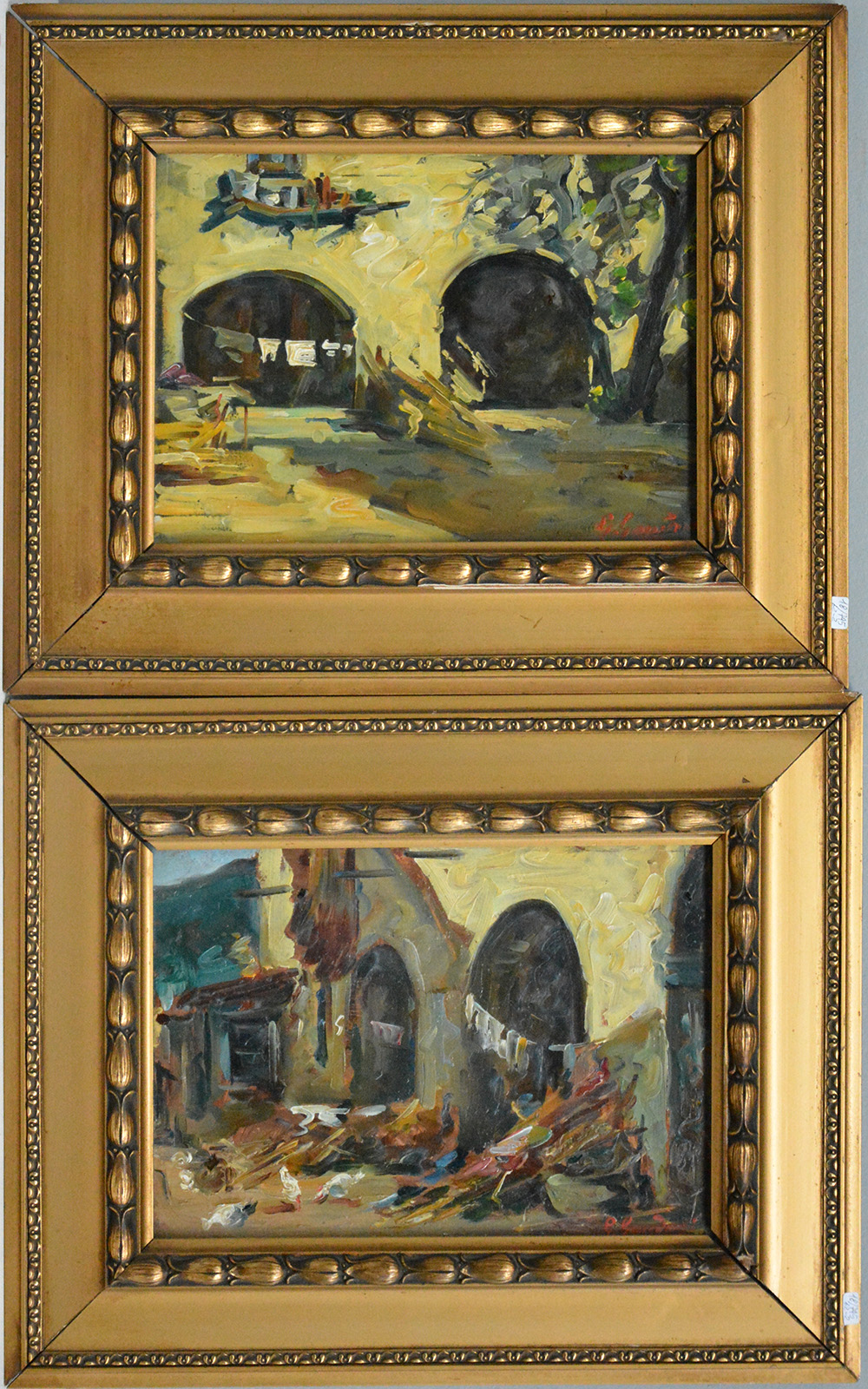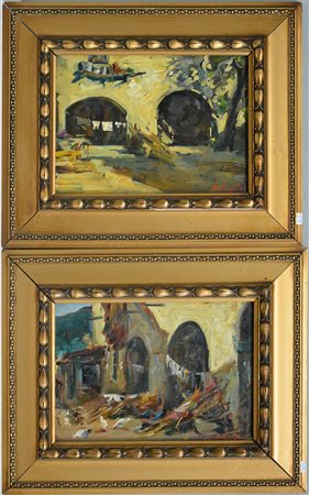 Firma indecifrata, "Scorcio di aia" coppia di dipinti ad olio su cartone (cm 21x29) firmati in basso a destra, in cornici (lievi difetti)