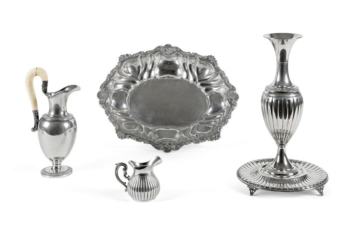 Lotto in argento composto da: un centrotavola di forma polilobata; un versatoio con manico in avorio (rottura); un vaso poggiante su piccola alzatina; una lattiera