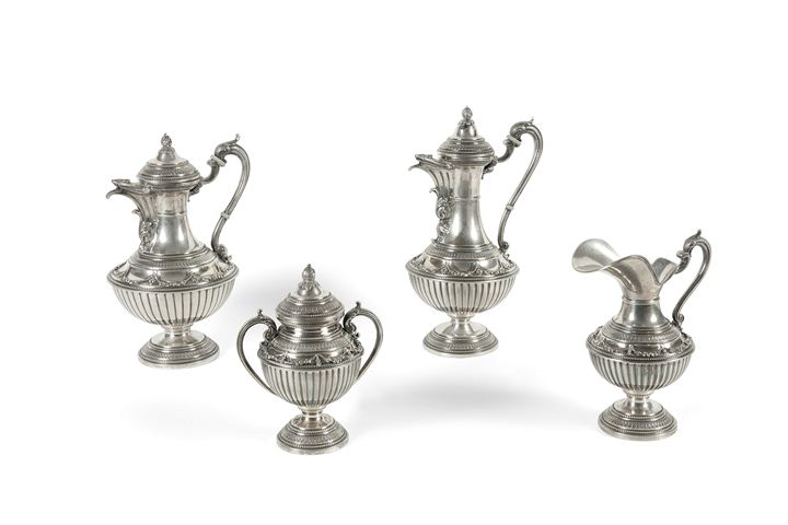 Servizio in argento composto da caffettiera, teiera, lattiera e zuccheriera,