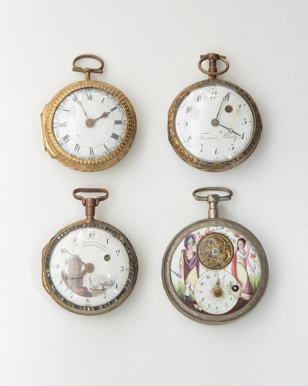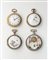 Lotto composto da quattro orologi da tasca in metallo e argento di diversi dimensioni e decori (difetti, mancanze)