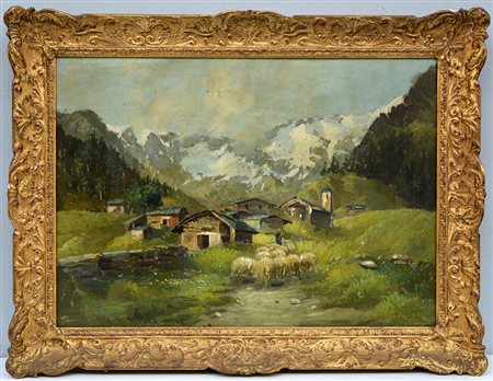 Riccardo Brambilla "Paesaggio montano con gregge" olio su compensato (cm...