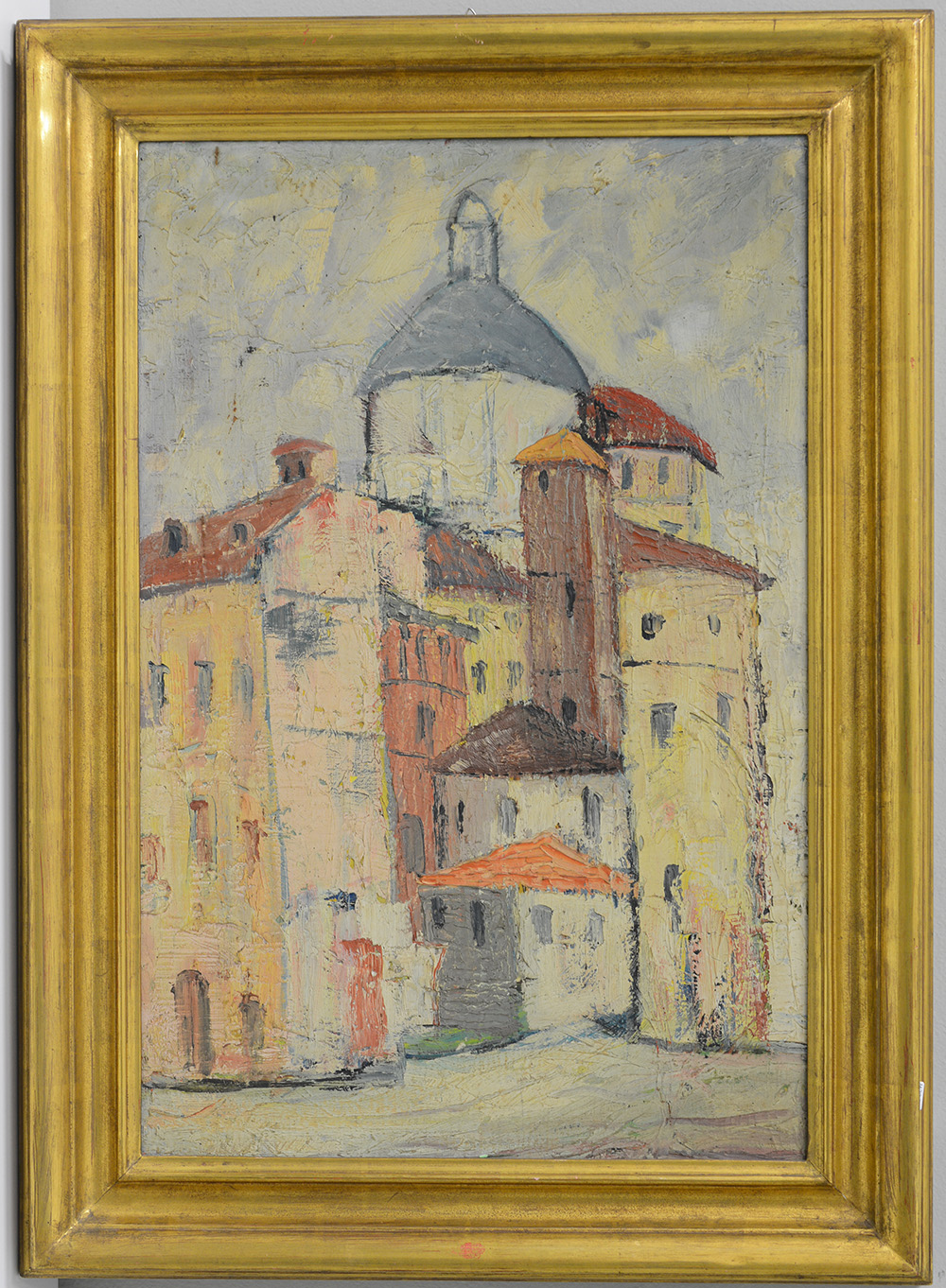 Ignoto, "Scorcio di edifici" olio su cartone telato (cm 60x39,5) in cornice
