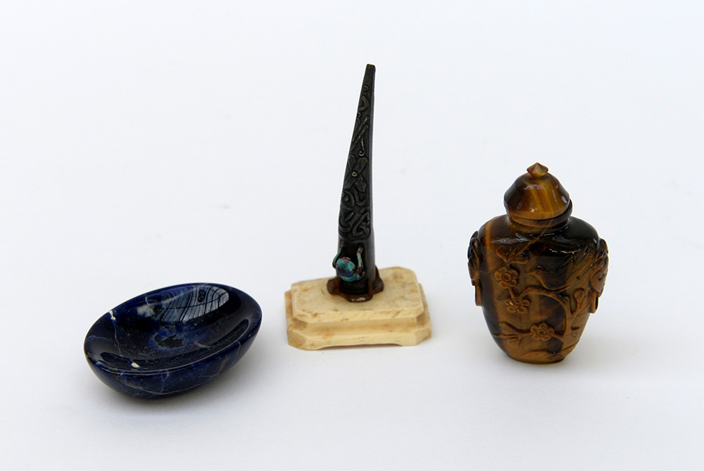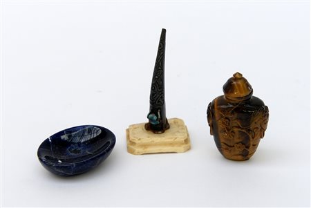 Lotto composto da una ciotolina in pietra dura, una snuff bottle in occhio di tigre e un oggetto in argento, di manifatture e provenienze diverse (difetti)