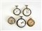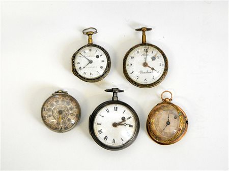 Lotto composto da cinque orologi da tasca in oro 18K, argento e metallo di diversi dimensioni e decori (difetti, mancanze)