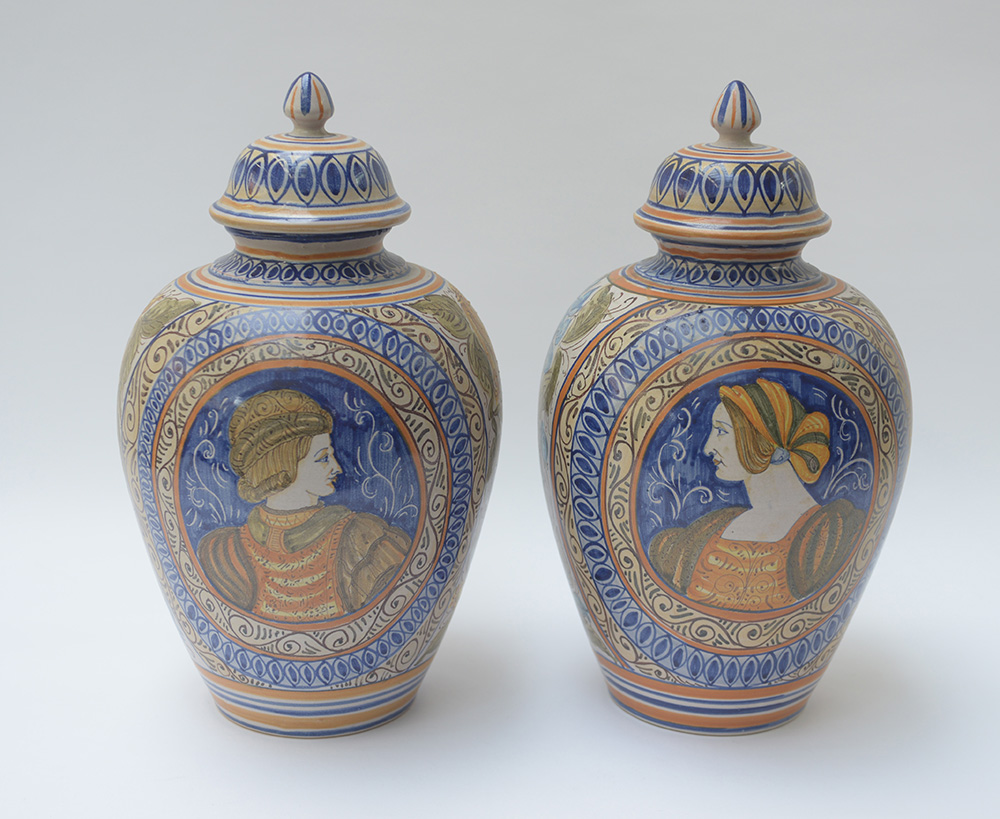 Manifattura di Castelli, coppia di potiches in ceramica dipinta in policromia a decori Neorinascimentali con medaglioni raffiguranti ritratti, maschili e femminili, di profilo. Firmati sotto la base (h cm 45)