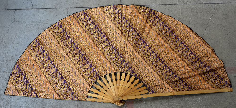 Ventaglio con stecchi di bambù e pagina con tessuto stampato a motivi batik profilati in oro. Indonesia secolo XX (cm 174x94) (lievi difetti)