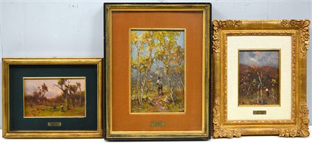 Lorenzo Gignous (Modena 1862 - Porto Ceresio 1958) "Paesaggi con figure" tre dipinti ad olio su cartone (misure varie) uno dei tre firmato in basso a sinistra. In cornici