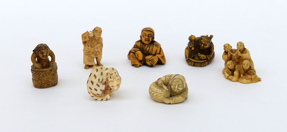 Gruppo di sette netsuke in avorio e resina, soggetti e misure diverse (h. max cm 5,5) Giappone, sec. XX