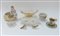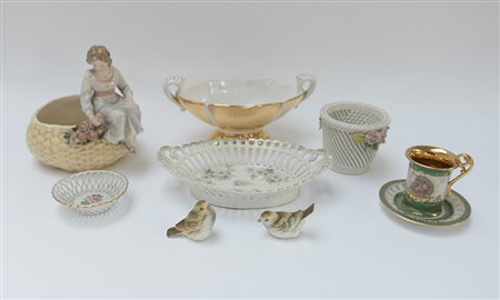 Lotto di ceramiche composto da tre cestini con bordi canestrati, una fioriera da tavolo con fanciulla a tuttotondo, una salsiera di Deruta, una tazzina tedesca con piattino e due saliere a forma di passerotti (difetti)