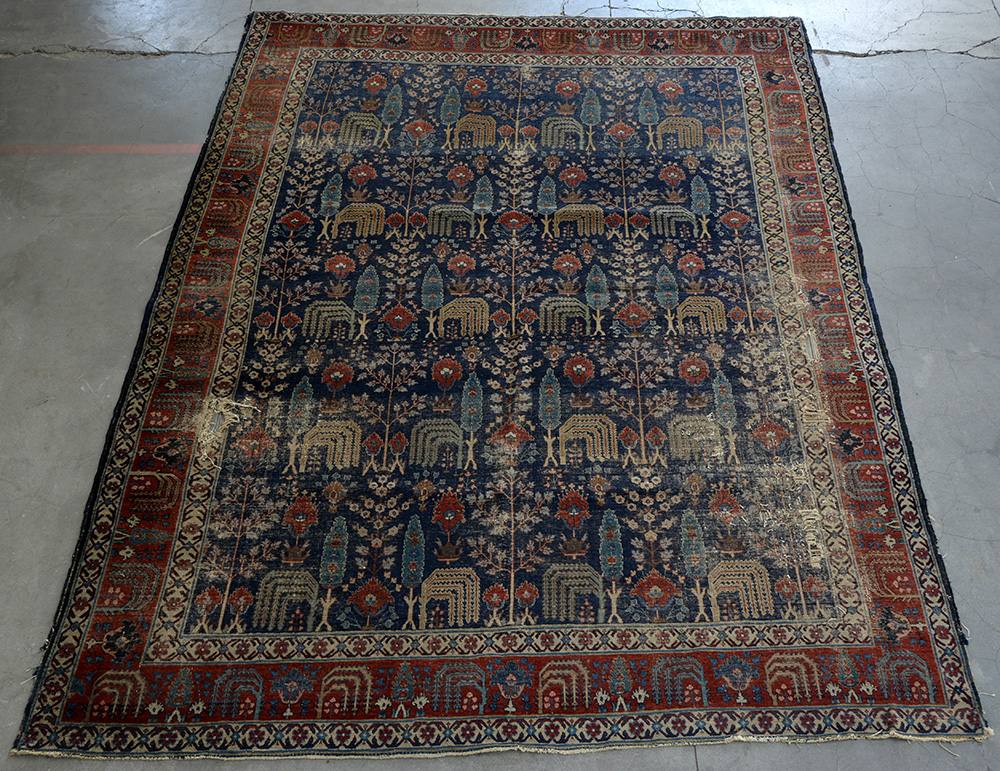 Tappeto Heritz, Persia fine secolo XIX Disegno a giardino con cipressi, salici piangenti e alberi fioriti su fondo blu (cm 365x278) (gravi difetti)