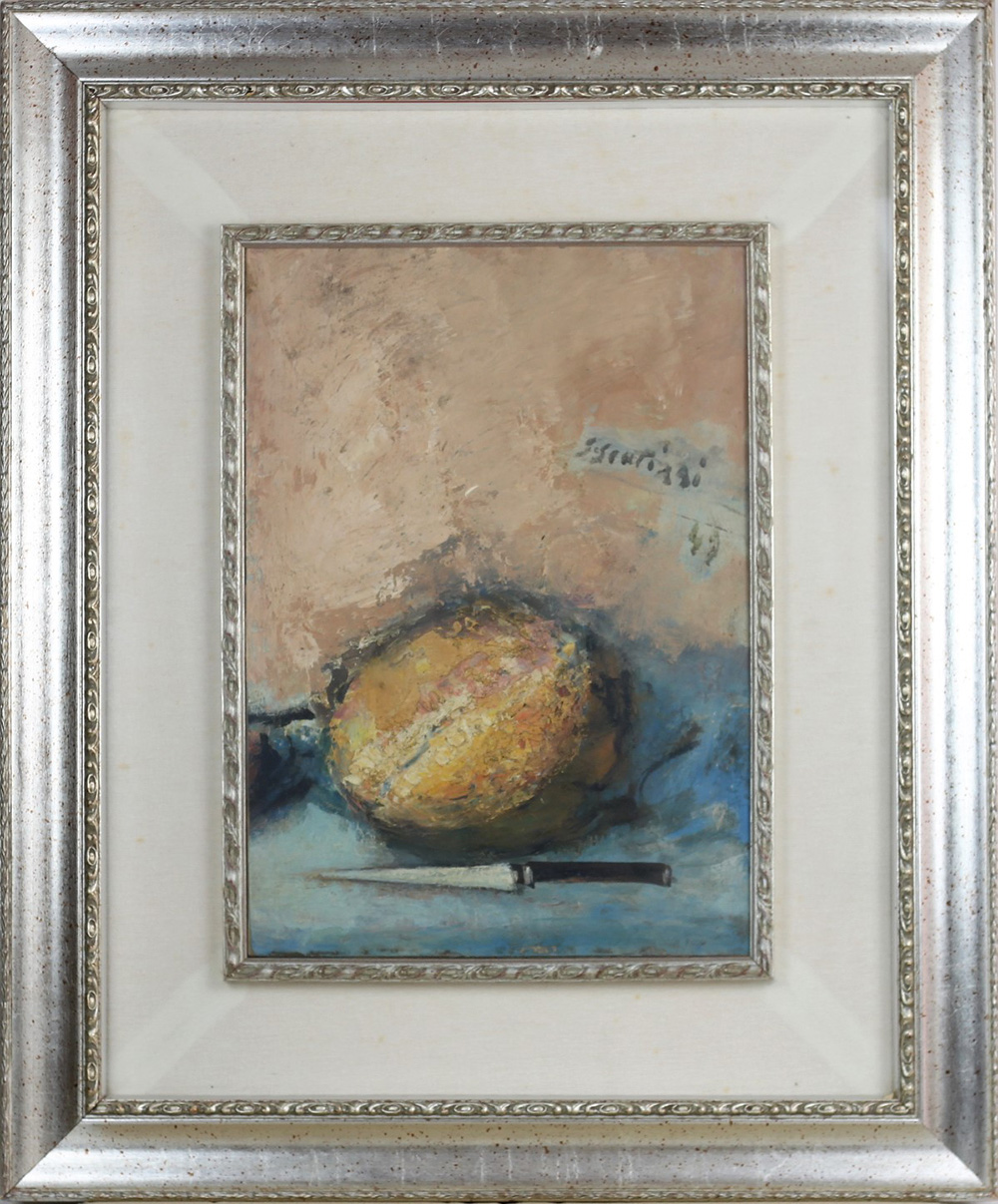 SCATIZZI SERGIO (CAPANNORI 1918 FIRENZE 2009), Natura morta sul tavolo, Olio su cartone Dim. 50,3x35,3 Anno 1949 Opera archiviata presso la Galleria Il Fiore Datato e firmato al centro dx