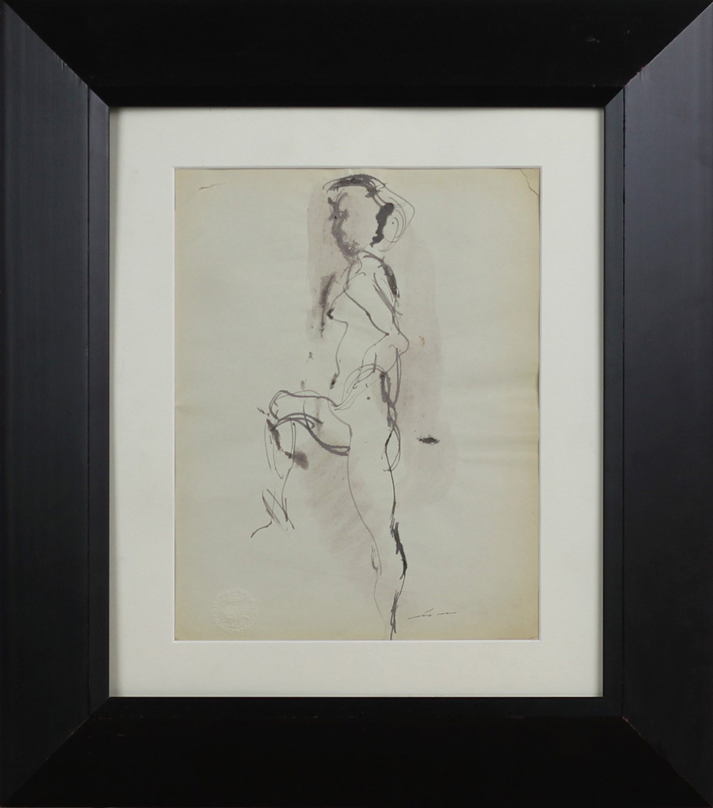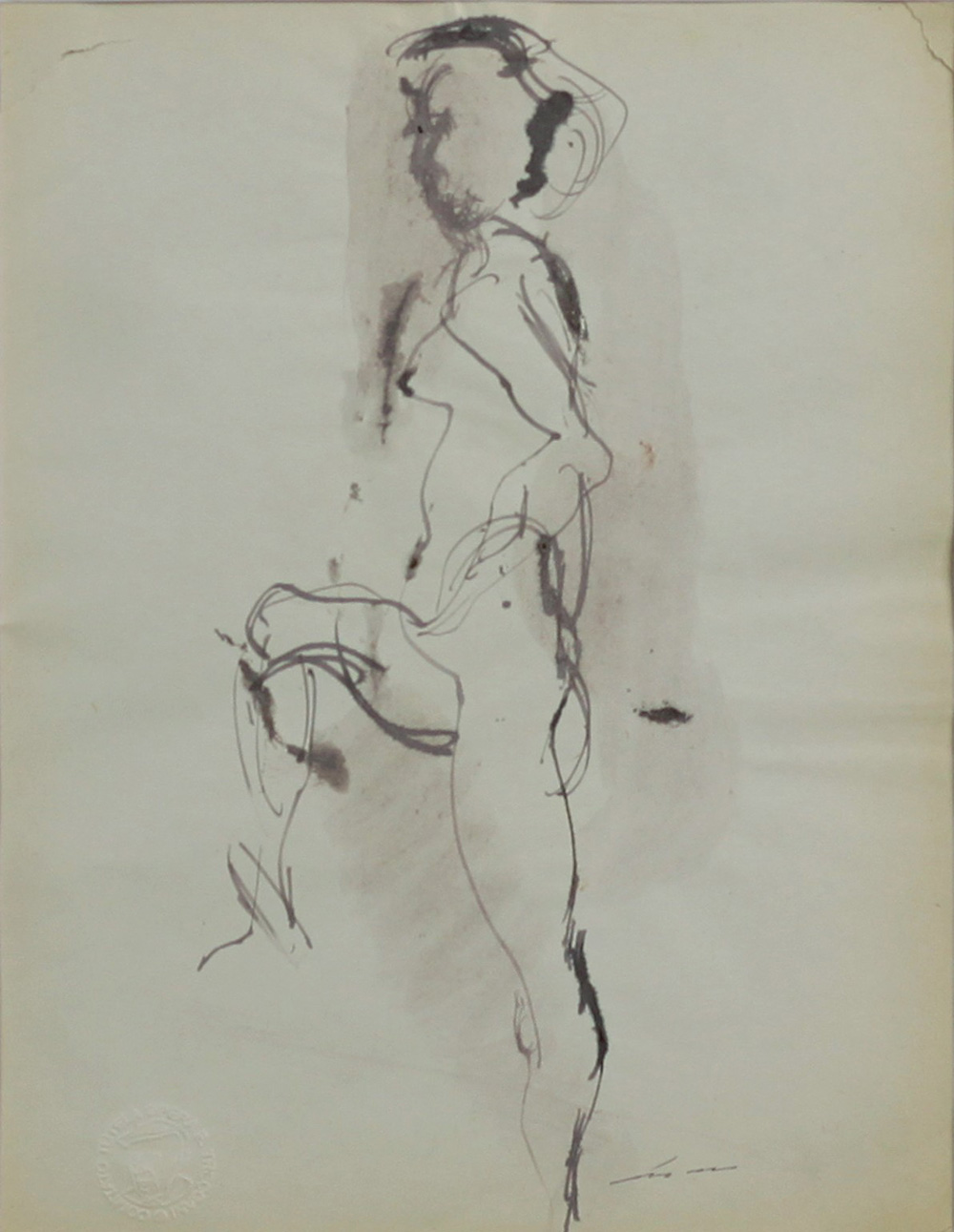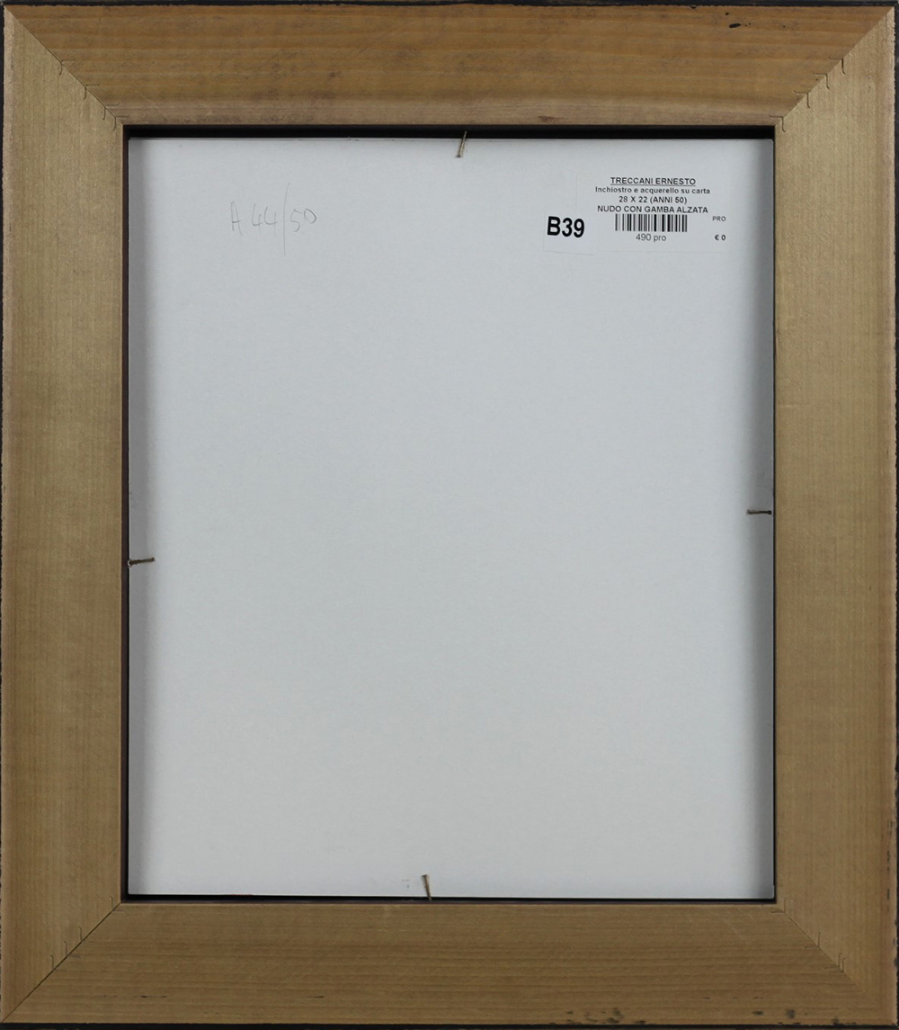 TRECCANI ERNESTO (MILANO 1920 MILANO 2009), Nudo con gamba alzata, Inchiostro e acquerello su carta Anni 50 Dim. 28x22 Opera archiviata presso l'Archivio Treccani su foto Timbro Fondazione Treccani in basso a sx Firmato in basso a dx