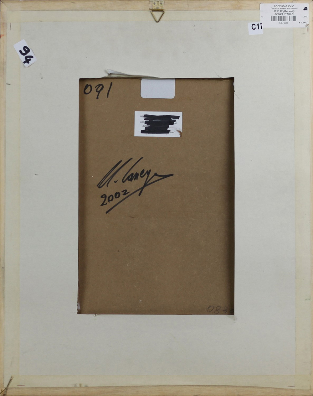 CARREGA UGO (GENOVA 1935 MILANO 2014), Senza titolo, Tecnica mista su tavola Anno 2002 Dim. 38x27 Datato e firmato al verso