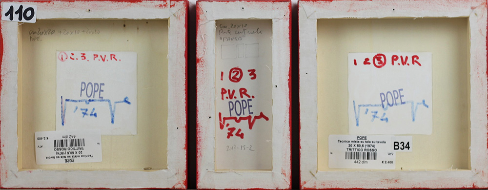 POPE (PORTOGRUARO 1942), Trittico rosso, Tecnica mista su tela su tavola Anno 1974 Dim. 20x50,5 Autentica su foto dell'Artista Al verso misure anno e firma